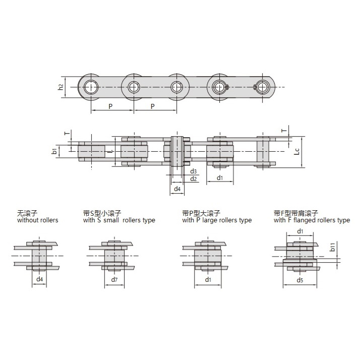 - Finns i rullfritt utförande eller utrustad med små rullar av S-typ, stora rullar av P-typ och axelrullar av F-typ för olika transmissionsbehov.