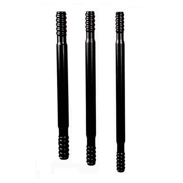 Den runda förlängningsstången överför kraften från bergborrmaskinens kolv till berget. Den ena änden av stången är ansluten till en kopplingshylsa eller skaftadapter, och den andra änden är ansluten till en gängad borrstång.